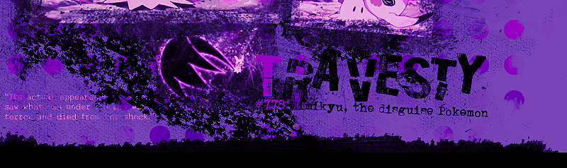 Version 1 of Travesty features three screen shots of Jessie's Mimikyu from the Pokémon anime. All other aspects of the layout were made by me or default to the Mac version of Adobe Photoshop CS5, with the exception of fonts downloaded from Dafont. This version does not have a navigation; keep scrolling down to view the content!
